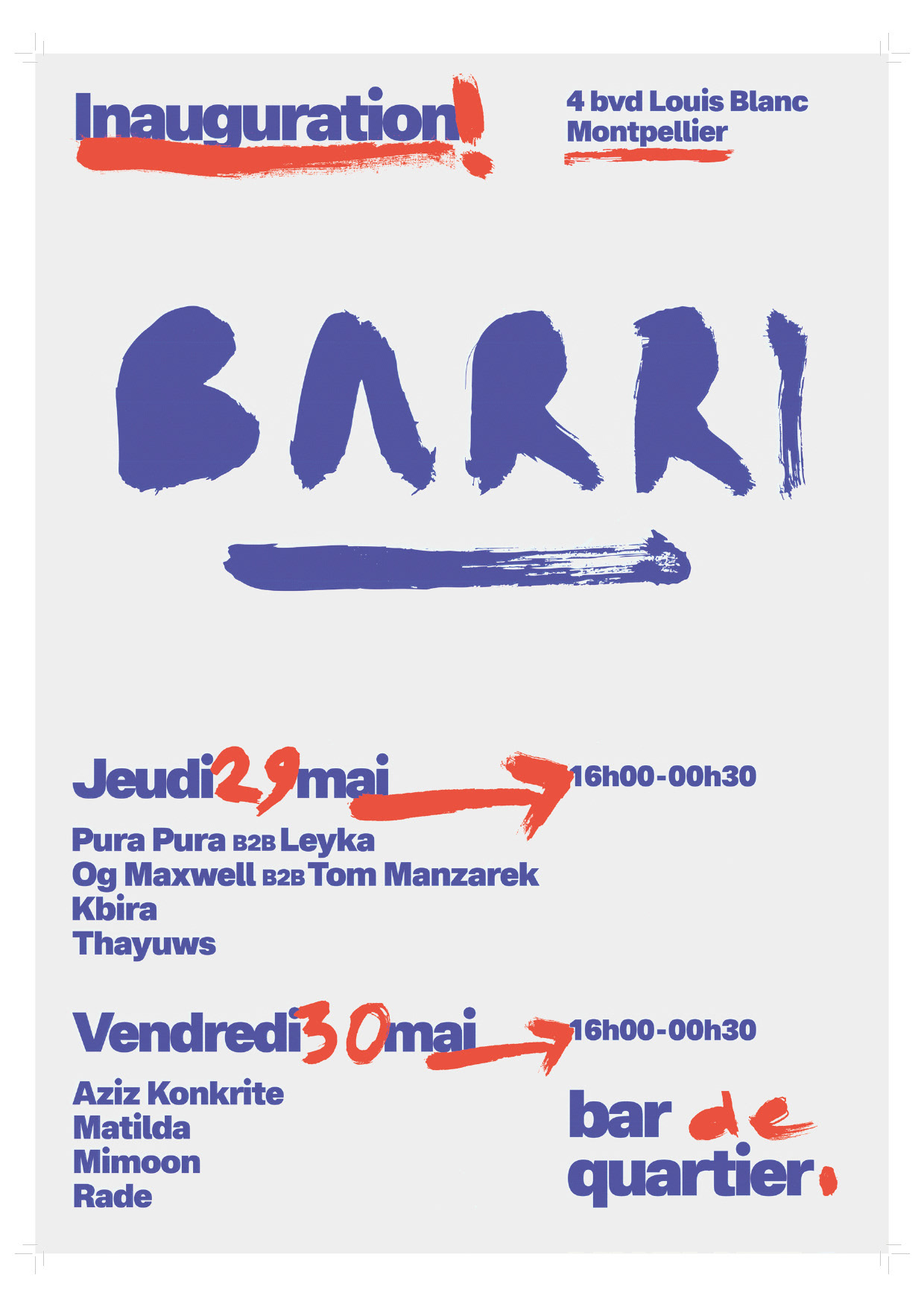 Logo, typography, menu's layout and poster design for Montpellier's neighborhood bar Barri