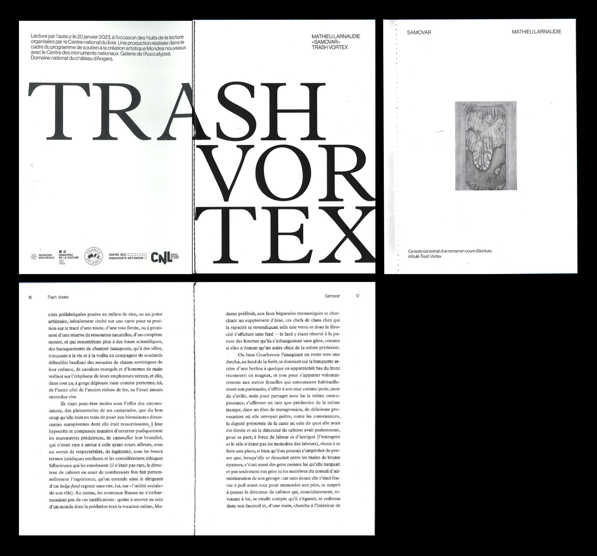 Layout and print supervision of a booklet featuring the first chapter of the novel Trash Vortex by Mathieu Larnaudie for the Nuit de la Lecture 2023. Printed by L'Imprimerie du Marais in Paris, 2023.148x210mm.